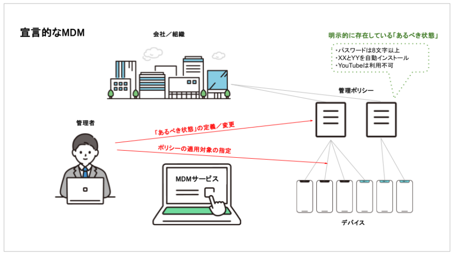 従来のデバイス管理の考え方は、「デバイスのあるべき状態」をMDMサービス利用の管理者が想定したうえで管理パネル等を操作し、個々のデバイスにコマンドを実行するというものでした。いっぽう、宣言型のデバイス管理においては、「デバイスのあるべき状態」をデバイスに伝える(宣言する)だけで、デバイス自身が自主的にその状態になるように動作します。