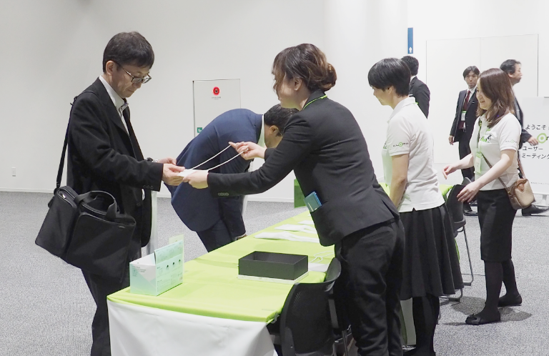 - A. 名刺を2枚ご用意ください。1枚は受付にて頂戴し、1枚はネームホルダーに入れていただきます。